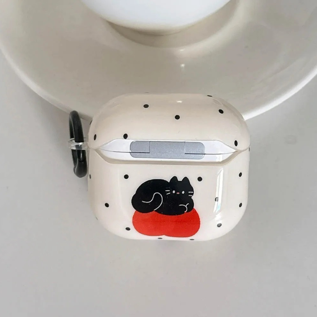 🐾 Playful Cat Design: Features an adorable black cat curled up on a bright red cushion, surrounded by a simple black polka-dot pattern for a fun yet clean aesthetic.